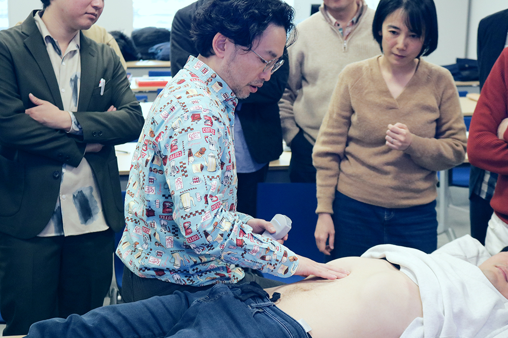エコーや耳鏡などを使って実際のデバイスの使い方を学ぶこともあります。また、デバイスを使わなくても、触診や聴診について、あらためて考え、手を動かしてリアルな経験を共有します。